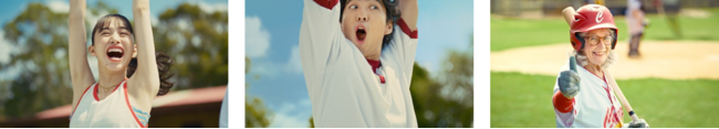 そんなハートフルなコミュニケーションの後、「あ、自由の味だ!」と、再び“ジムビームハイボール”を味わう賀来さんと井桁さん。そして「カキーン!」と快音が響き、見事なヒットを打ったおばあさんバッターが駆け出す中、賀来さんと井桁さんも大喜びでガッツポーズ。高揚感で満たされた球場に、「ジムビーム」の爽快でアクティブなイメージがマッチし、心を自由に解放する楽しさが描かれています。