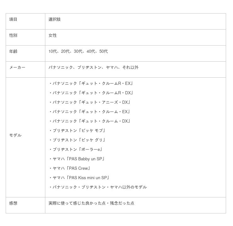 子ども乗せ電動アシスト自転車購入者を対象に保有しているメーカー、モデル名、実際に利用して感じたことのアンケート調査を実施し解析したので、その結果を発表致します。