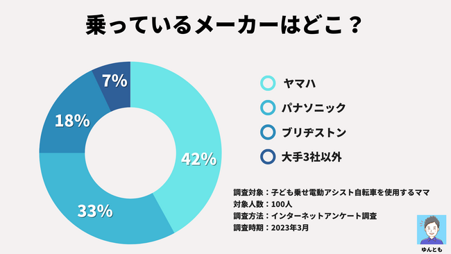 今乗っているメーカーを調査したところ、ヤマハが42%と一番高く、続いてパナソニックが33%、ブリヂストンが18%、その他メーカーが7%の結果でした。