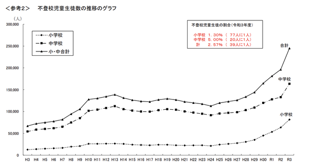 文部科学省の令和3年度の調査によると、小中学校の不登校児童生徒数は24万人を超え、9年連続で増加し過去最多となりました。児童生徒の自殺者数も増加しており、特に女子高校生の自殺者数は著しく増加しています。