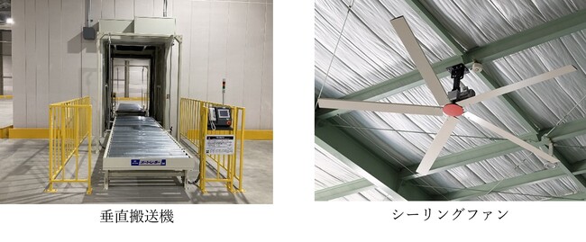 各階フロアにシーリングファンを設置して結露対策を行っています。3階倉庫には83機の空調設備を設置して、庫内荷役作業者や流通加工作業者の労働環境対策を行っています。環境対策として屋上に太陽光パネルを設置し、当施設の日中の電力を賄い、余剰電力は売電する予定です(CASBEE認証Aランク取得済、BELS認証5スター及びZEB認証を取得予定)。トラックもEVトラックを5台導入し環境に配慮しています。