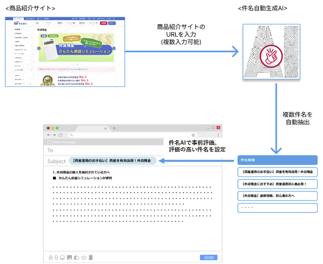 商品紹介サイトなどのコンテンツに基づき、ChatGPT(AI)などを用いて自動的に複数の件名候補を抽出します。