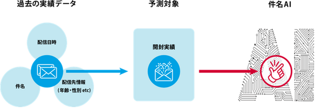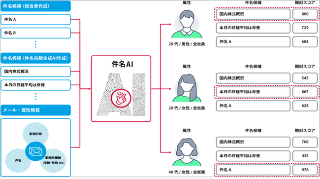配信対象ユーザーごとに最適な件名を判定するため、件名やユーザーの行動情報、属性情報等を基に、メールの開封結果を予測する「件名AI」を実行し、開封率の予測値を「開封スコア」として算出します。