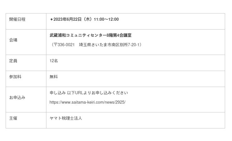 バックオフィスのクラウド化と改善に特化しているヤマト税理士法人(本社:埼玉県さいたま市、代表:北村喜久則、以下「当社」)は、2023年10月から施行されるインボイス制度について具体的な対応方法と施行後増える負担を60分間でつかめる「インボイス×電子帳簿保存法対応セミナー」をリアルで2023年6月22日に開催いたします。中小企業の皆様が、2022年10月の施行までに必ず対応する必要がある「インボイス制度」について、本セミナーをお役立ていただけますと幸いです。
