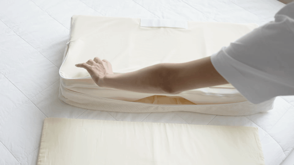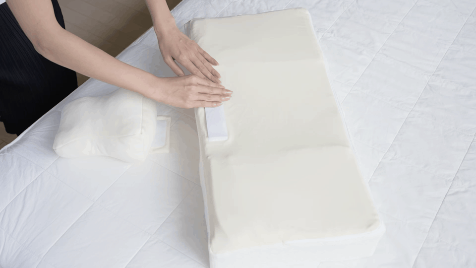 横向きで寝たときの高さを調整するためのスライド。頸椎を水平に保つことができます。シート状のウレタンが左右に各1 枚ずつ(厚さ1cm)付属されています。