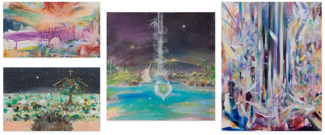 本展では、ヒプノセラピストの宇野豪佑による100人とのセッションで導き出された言葉をもとに、画家の中村峻介がイメージを受け取り描いた100枚の絵画を展示します。各作品は、深いリラクゼーション状態の中で見えた景色やイメージ、内的世界の旅を映し出しています。