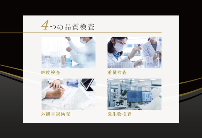 さらに製品の安全性と品質を高く保ち続けるために、「純度検査」「重量検査」「外観目視検査」「微生物検査」の4つの検査を重ね、クリアしたものだけが製品となっています。