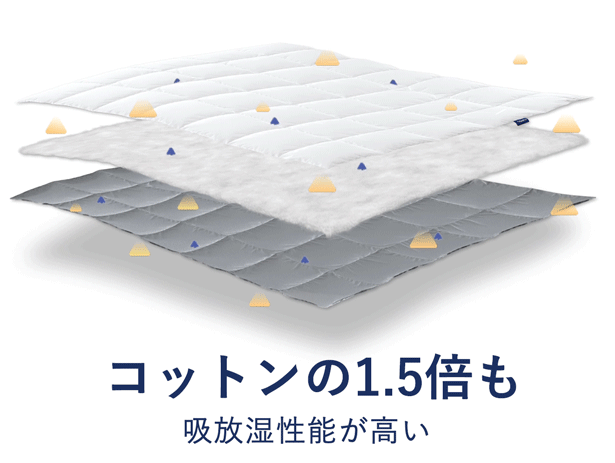 シルク素材の特殊な繊維構造により、吸放湿性能は綿の約1.5倍。さらに、綿よりも迅速な湿気放出が可能。暖かさを保ちつつムレの少ない寝具環境を実現し、抗菌・防臭効果も発揮します!