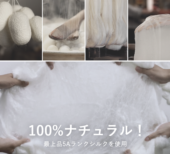 5Aランクの天然シルクを詰め物として100%使用。まるで雲に包まれているような柔らかさで自分史上最高の睡眠環境を作ってくれます。