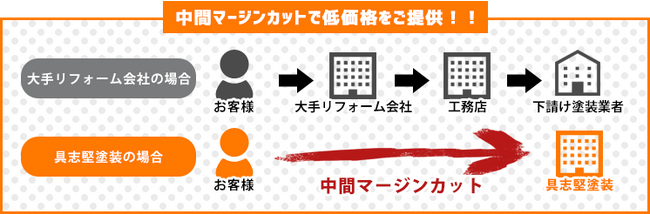 これにより、大手リフォーム会社経由の場合に起きることがある、工務店や下請け塗装業者の職人の意思疎通の不足や伝達ミスによるトラブルが発生する心配がありません。また、営業マンやスタッフの経費負担がなくなり、その分を低価格としてお客様に還元することが出来るのです。