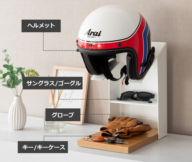 たとえば玄関などの限られたスペースにバイカーの必需品を飾りながら収納できる。