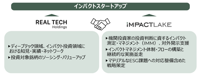 株式会社IMPACTLAKE(所在地:東京都千代田区、代表取締役:関野麗於直、以下「IMPACTLAKE」)とリアルテックホールディングス株式会社(所在地:東京都墨田区、代表:丸幸弘、永田暁彦、以下「リアルテックホールディングス」)は、インパクト投資の更なる強化・高度化を実現するべく、協業を開始いたします。