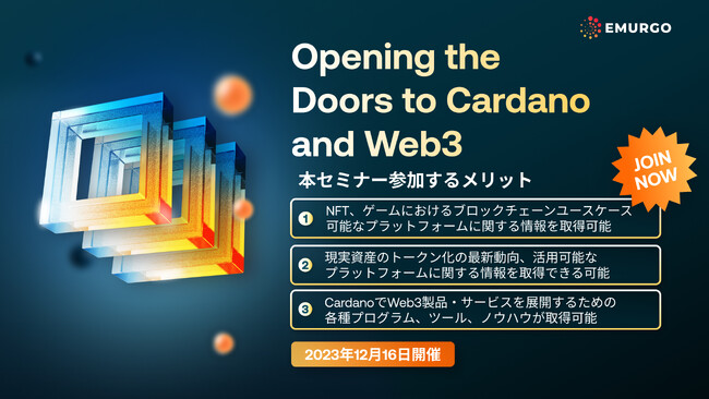 東京、2023年11月27日 - EMURGO Group Pte. Ltd.(以下「EMURGO」)は本日、2023年12月16日に日本、東京で開催されるブロックチェーンミートアップイベント「Opening Doors to the Cardano Blockchain and Web3」を発表致しました。