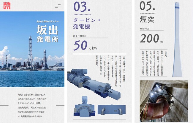 4箇所の火力発電所毎にページを設けて紹介しており、以下のコンテンツで構成。