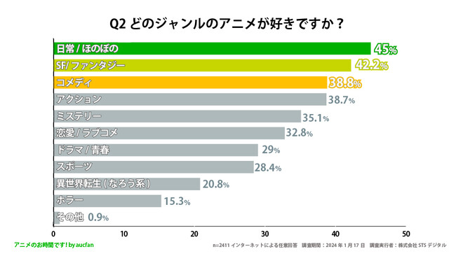 Q2 最も多かった回答が「日常/ほのぼの」で45%、次点で「コメディ」が38.8%という結果になりました。