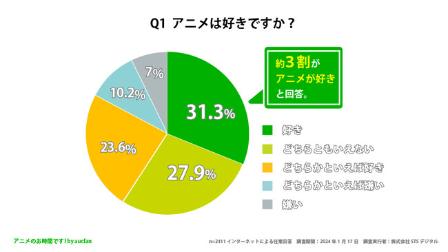 株式会社STSデジタルと株式会社オークファンが共同運営しているアニメのお時間です!(URL:https://aucfan.com/vod/)は、20歳〜60歳の男女2411人を対象に「好きなアニメに関するアンケート調査」を実施しました。