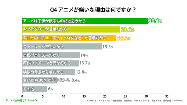最も多い回答が「アニメは子供が観るものだと思うから」で30.4%、次点で「キャラクターが苦手だから」が23.6%でした。