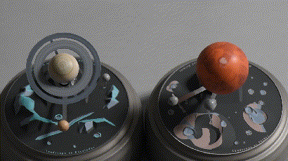 博物館のジオラマ展示のような「衛星から眺めた風景」をコンセプトにした作りで、衛星レリーフ上をそれぞれ回転する惑星と衛星が手のひらサイズのガラスドームに収められています。