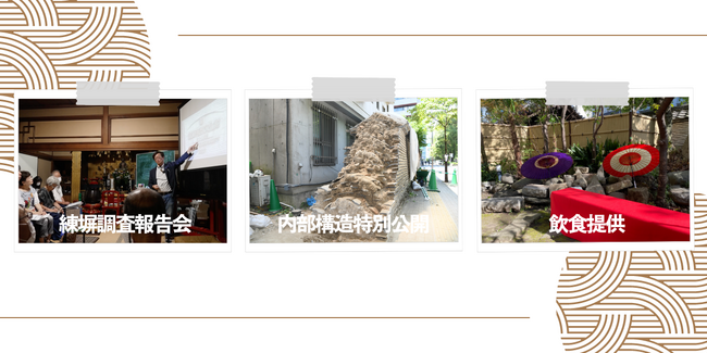 廣度院では、江戸時代から存在する貴重な練塀の解体調査を2023年9月に行い「江戸城造営関係資料集」に記された練塀の内部構造と一致することを発見しました。徳川幕府との深い関係やリサイクル文化の江戸時代における考えられた構造であることなど、これまで分かってきた調査内容を発表します。また、貴重な練塀の内部構造を特別公開します。飲食事業者による屋台を出店し、歴史を学ぶだけではなく訪れる皆さまが交流できるよう、境内の庭園に休憩処を設置します。
