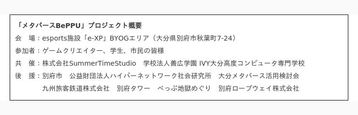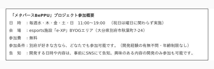 本プロジェクトは、「別府市制100周年」を記念し、現役のゲームクリエイターと学生、市民の皆様が、Epic Games社のゲーム開発アプリケーション「Unreal Editor for Fortnite(UEFN)」を使い、情緒あふれる別府の街並みや温泉地をメタバース(仮想の3D空間)上に作り上げる市民参加型プロジェクトです。