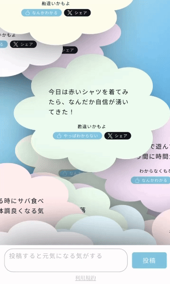 ぷらしぼクラウド雲に見立てたユーザーのみなさまの投稿をWebサイト上でフワフワ浮遊させています。雲をかき分け、共感できるプラシーボ効果を見つけてみてください。明確なエビデンスがなくふわふわとした内容でも投稿できることを表現しています。