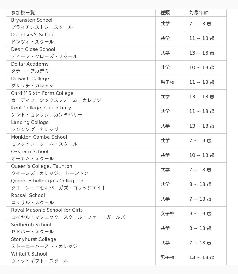 会場では17校の代表者が、サマースクールからAレベル、IB、GCSEコース、奨学金入試に至るまで、多彩な留学プログラムについて直接ご相談をお受けいたします。参加校は共学、男子、女子の小学校(プレップスクール)から中高一貫校(シニアスクール)まで、幅広い層を対象にした17校がそろいます。