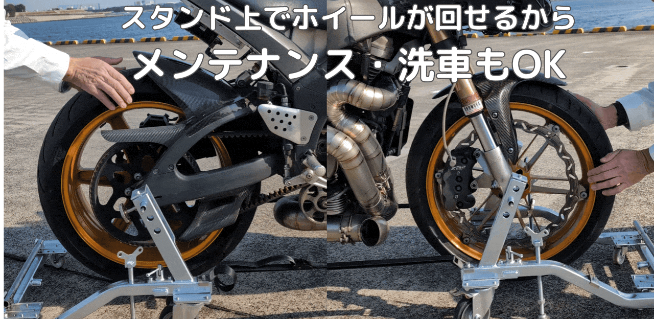 バイクをスタンド設置状態で前後輪を回転させることができ、ホイール周りの清掃やメンテナンスが容易になりました
