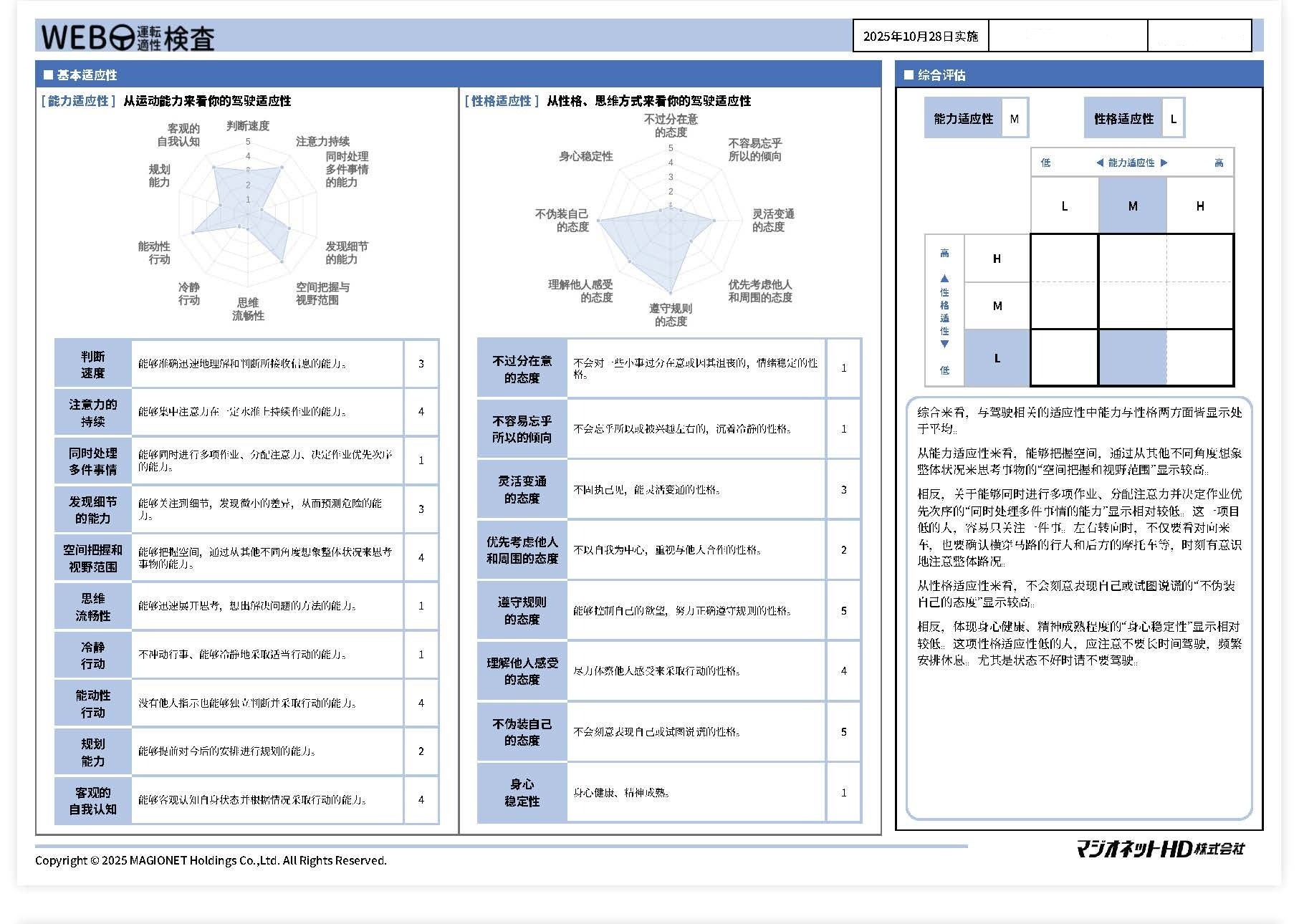 マジオネットHDが開発した「WEB運転適性検査」は、運転者の性格傾向・判断特性・危険感受性を科学的に分析し、交通事故リスクの低減を支援するクラウド型の適性検査システムです。
