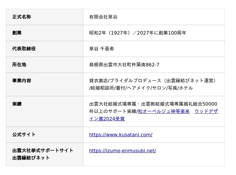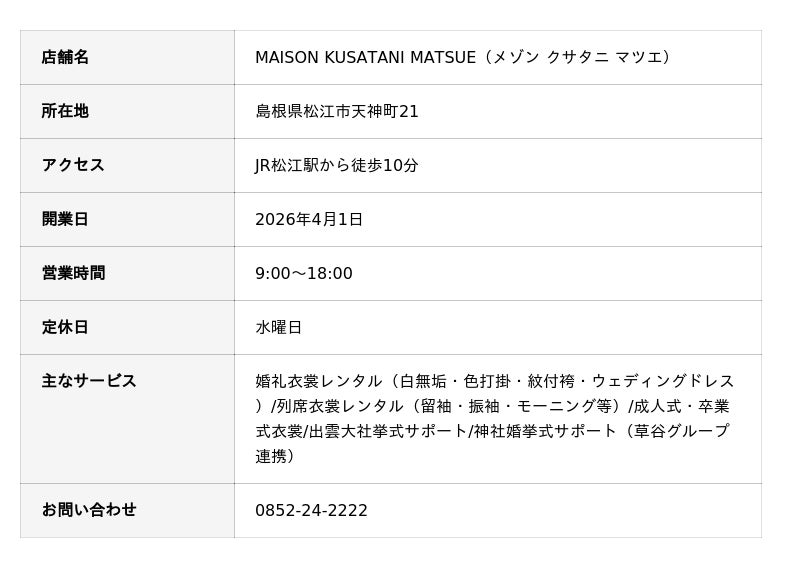 出雲大社専属の婚礼衣裳・ブライダルサポート・ホテル事業を手がける有限会社草谷(所在地:島根県出雲市大社町杵築南862-7、代表取締役:草谷 千亜希)は、昭和37年創業の老舗婚礼衣裳専門店・株式会社むらまつ(所在地:島根県松江市天神町21、代表取締役:村松 直久)と合併し、旧むらまつ店舗にて「MAISON KUSATANI MATSUE(メゾン草谷松江)」をスタートすることをお知らせいたします。