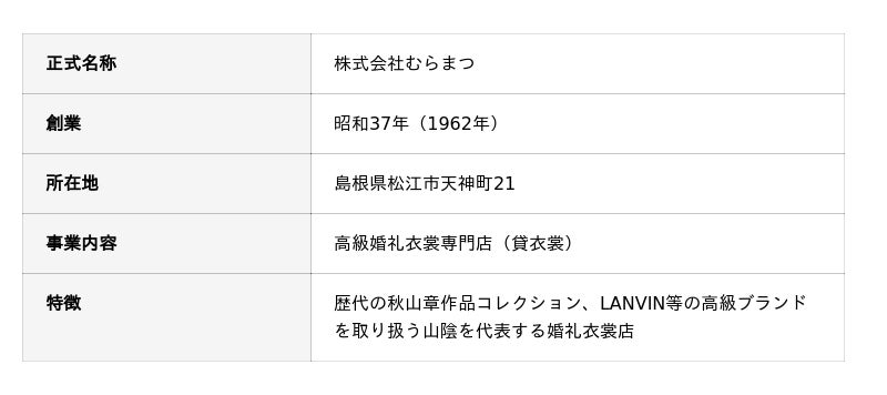 「むらまつ」は昭和37年の創業以来、60年以上にわたって松江の地で婚礼衣裳を提供してきた老舗専門店です。城下町・松江に根ざし、地域の皆様の人生の晴れ舞台を支え続けてきた同店は、歴代の秋山章作品をはじめとする高級和装コレクションと、長年にわたって培ってきた地域からの信頼が大きな財産となっておりました。