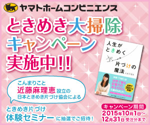 ヤマトホールディングス傘下で、引越サービスやお片付けサービスといった生活支援事業を行うヤマトホームコンビニエンス株式会社(本社 東京都中央区、代表取締役社長 市野厚史、以下ヤマトHC)は、このたび、2015年10月1日(木)より、「快適生活サポートサービス」提供開始1周年を記念して、片づけコンサルタント・近藤 麻理恵氏が設立した「日本ときめき片づけ協会」とのタイアップキャンペーン「クロネコヤマトで年末を快適に!ときめき大掃除キャンペーン」を実施いたします。