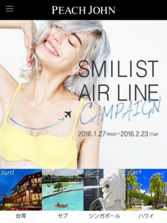 その発売に合わせ、ピーチ・ジョン公式WEBサイトでは、1月27日(水)より、「SMILEマイル」を貯めると豪華海外旅行が当たる「SMILIST AIR LINE CAMPAIGN(スマイリスト エア ライン キャンペーン)」を展開いたします。