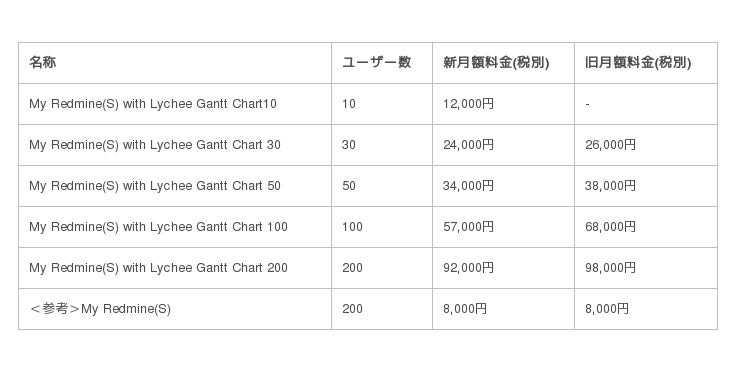「My Redmine with Lychee Gantt Chart」は、My RedmineにLychee Gantt Chart PROを組み込んだ状態で提供するものです。これまで提供していたサービスプランに加え、プロジェクトマネージャー向けの機能をより強化したサービスプランをご利用いただけるようになりました。