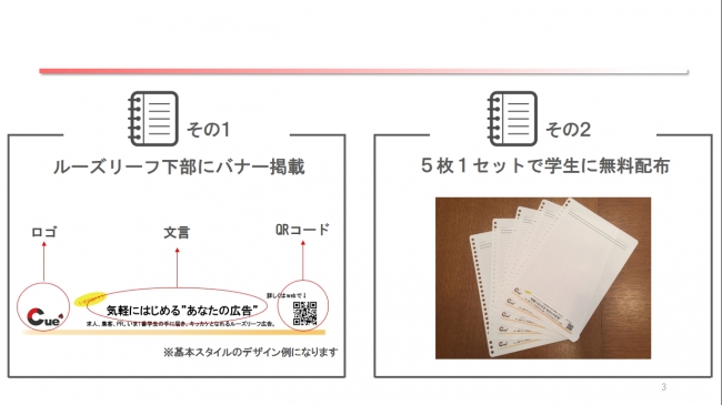 当事業は広告費によって運営しているため、学生にはルーズリーフを無料で配布致します。また、掲載される広告バナーにはQRコードも設置可能なので、SNSなどのWEB媒体とも連携させたより効果的な広告媒体としてご利用いただけます。