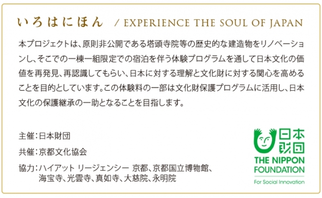 原則非公開である塔頭寺院等の歴史的な建造物をリノベーションし、そこでの一棟一組限定での宿泊を伴う体験プログラムを通して日本文化の価値を再発見、再認識してもらい、日本に対する理解と文化財に対する関心を高めることを目的としています。利用料の一部は文化財保護プログラムに活用し、日本文化の保護継承の一助となることを目指します。