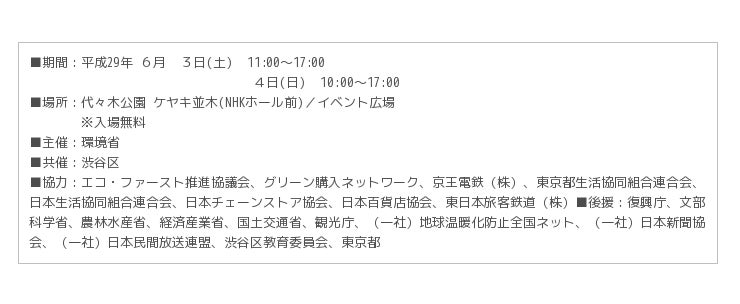 詳細については、エコライフ・フェア2017公式Webサイト http://ecolifefair.env.go.jp/ をご覧ください。
