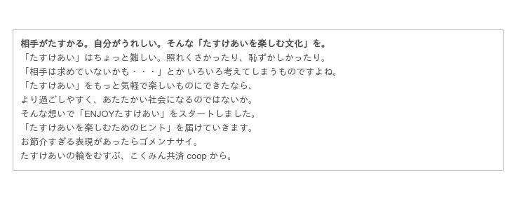 こくみん共済coop は、昨年10月から「たすけあいをもっと気軽に楽しいものにできたなら、より過ごしやすく、あたたかい社会になるのではないか」という想いで「ENJOYたすけあい」プロジェクトを実施しています。本調査結果を受けて、「ENJOYたすけあい」の活動を普及し、日本が「たすけあいにあふれた社会」となるための一助となるよう、取り組んでまいります。
