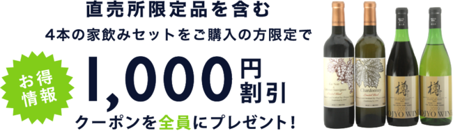 【直売所限定品含む4本の家飲みセット】をご購入いただいた方限定で、次回お買い物時からお使いいただける1,000円割引クーポンを全員にプレゼントいたします。