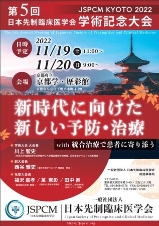 一般社団法人 日本先制臨床医学会(事務局:東京都文京区、理事長:愛知医科大学 福沢 嘉孝 教授)は、本年11月19日20日に京都府立 京都学・歴彩館で開催される第5回日本先制臨床医学会学術記念大会を開催することを決定いたしました。そのうえで、学術大会に併設される企業展示コーナーの出展企業様および学会当日の一般演題に登壇希望の医療従事者の公募を2022年6月より開始致します。