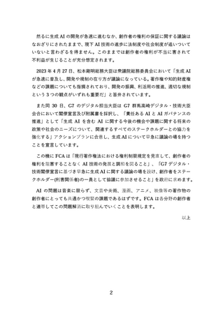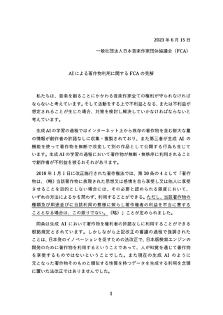 生成AIの開発が急速に進むなか、創作者の権利の保証に関する議論はなおざりにされたままで、現下AI技術の進歩に法制度や社会制度が追いついていない状況です。この状況を広く訴えるためにFCAは音楽作家を代表して意見を表明することとしました。