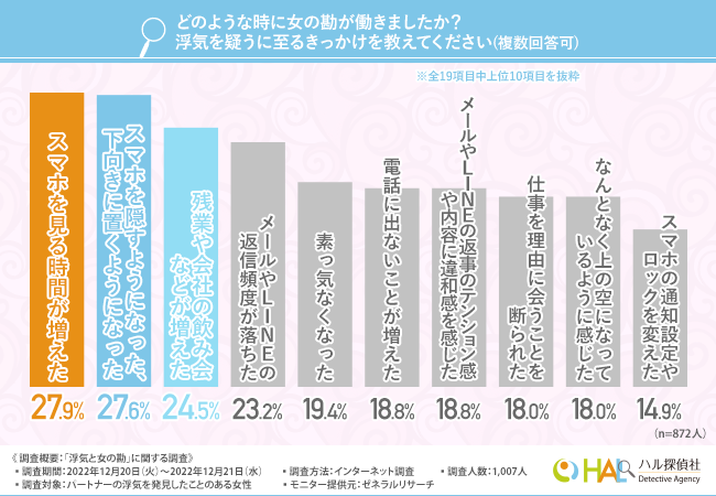そこで、「どのような時に女の勘が働きましたか?浮気を疑うに至るきっかけを教えてください(複数回答可)」と質問したところ、『スマホを見る時間が増えた(27.9%)』と回答した方が最も多く、次いで『スマホを隠すようになった、下向きに置くようになった(27.6%)』『残業や会社の飲み会などが増えた(24.5%)』と続きました。