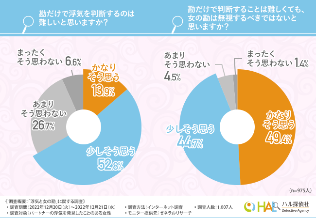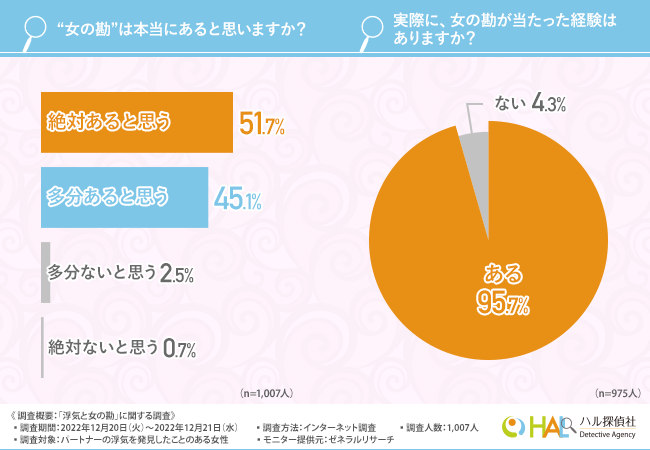 浮気・不倫調査や結婚信用調査、素行調査などを行うHAL探偵事務所(本社所在地:東京都新宿区、代表取締役:浅見 俊祐)は、パートナーの浮気を発見したことのある女性を対象に、「浮気と女の勘」に関する調査を実施しました。