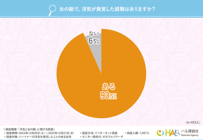 「女の勘で、浮気が発覚した経験はありますか?」と質問したところ、9割以上の方が『ある(93.5%)』と回答しました。