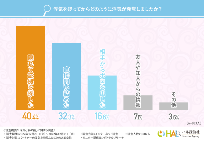 「浮気を疑ってからどのように浮気が発覚しましたか?」と質問したところ、『隠れて証拠を探した(40.4%)』と回答した方が最も多く、次いで『直接問い詰めた(32.3%)』『相手からボロを出した(16.6%)』と続きました。