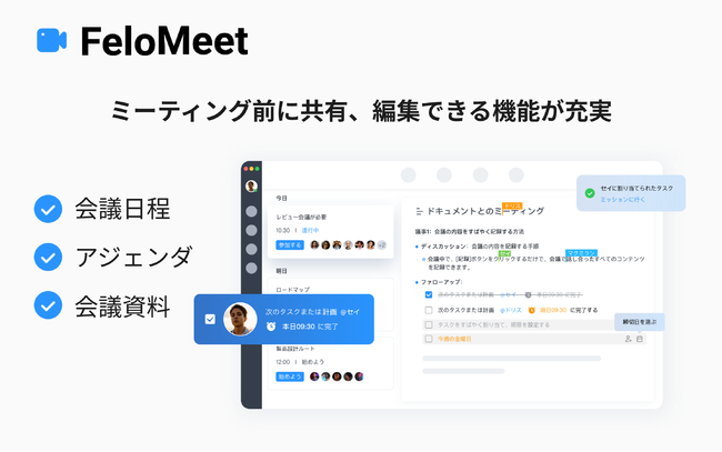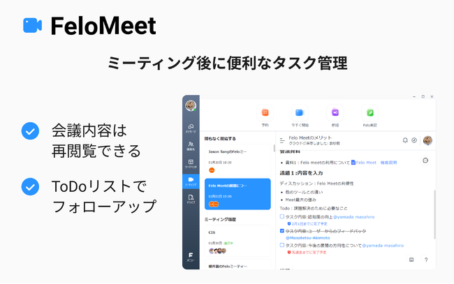 FeloMeetは、誰でも簡単にオンライン・ミーティングを主催でき、会議リンクを共有すれば、参加者はクリックするだけで参加できるツールです。ミーティング機能を備えているほか、アジェンダ、会議資料などを事前に参加者にシェアできます。合意した内容についてはToDoリストまでサポートし、担当者をアサインするなど便利な機能も充実しています。