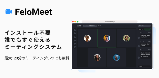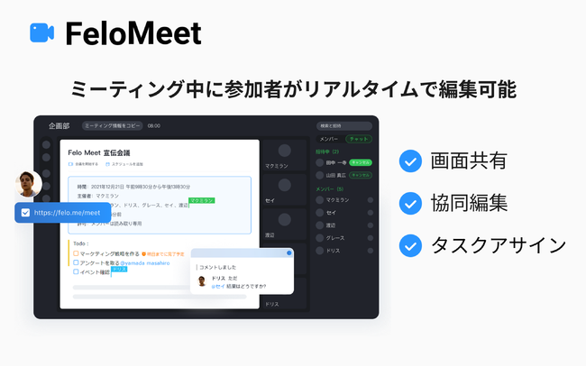本聡株式会社 (所在地:東京都中央区日本橋)はこの度、協同編集文書をベースに効率的なオンライン・ミーティング体験を創出する"FeloMeet"をリリースいたしました。インストール不要、One-Clickで参加や会議前にアジェンダのシェアなど、これまでのミーティングツールにはなかった新しい会議を体験できます。 https://felomeet.jp