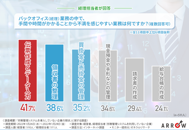 今回の調査で、経理担当者の多くが“バックオフィス(経理)”業務に無駄が多いと感じ、不満を抱いていることが判明しました。