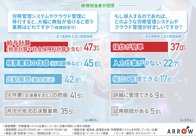 そして、実務に取り組む皆さんが経理業務などに多くの無駄があると感じ、その解決について労務管理システムに期待していることもわかったと思います。