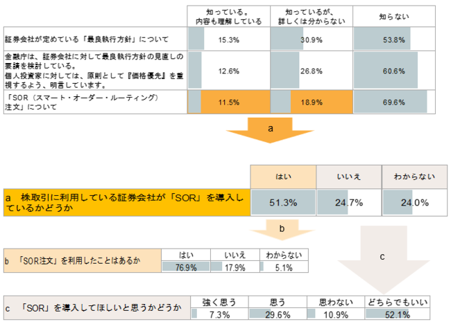 以上より、価格を最も重視していると大多数が回答している中、最良価格での注文執行を助ける「SOR」について理解している個人投資家でも、「SOR」の導入に対してはそれほど積極的ではなく、「SOR」の利用による価格改善効果等がまだまだ認識されていないことが明らかになりました。