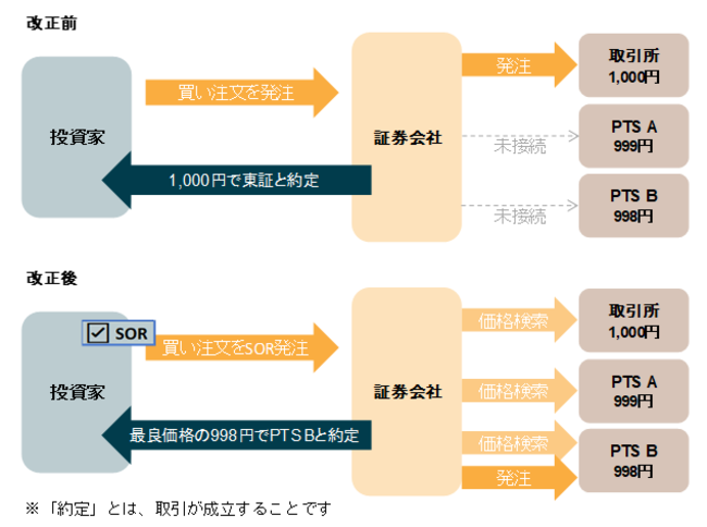 取引所とPTSに接続した場合、証券会社は、取引所とPTSで提示されている価格を比較した上で、個人投資家の注文を、より有利な価格を提示する取引施設に回送することになります。この価格比較は、瞬時に行わなければならないため、システムを使うことが必要です。このシステムは「SOR(スマート・オーダー・ルーティング)」と呼ばれます。